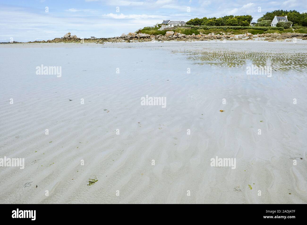 Ebb At A Beach At The Coastline Of Brittany Blue Sky With Clouds
